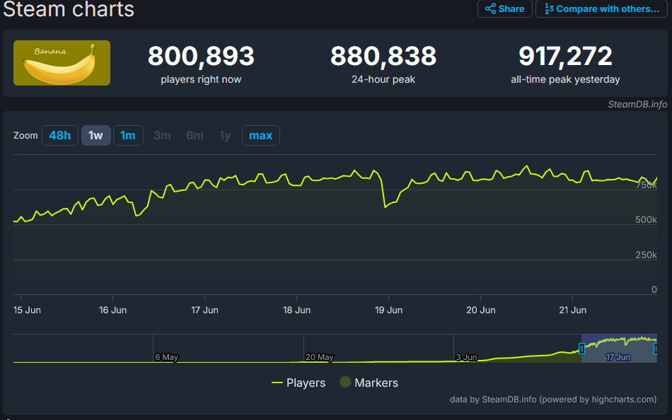 Yes you heard it right. There is a game that is currently on steam that’s been going viral which is free to play and all you do is click on a banana. No gimmicks or pyramid schemes even the dev’s have said that there is no scam. All you do is just click the banana on screen and i’ve been keeping track of this game as i’ve been meaning to post about it. Why you ask? well it’s just bananas and we are bananas about entertainment and this is technically a game. You can have a look at the game here! At the time of posting this article there is over 800,000 people playing it!